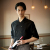 ローネックの襟元が爽やかなモノトーンコックシャツスタイル。