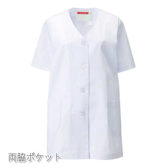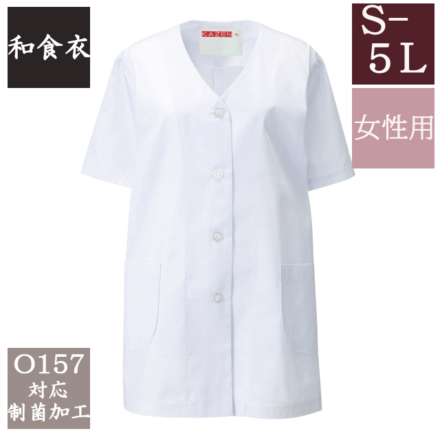 332-30 カゼン 和食衣 衿なし 調理衣 半袖 女性用 ブロード 制菌加工 白衣 女子 和食 日本食 料亭 割烹 旅館 レストラン 料理屋 厨房 食堂 飲食店 和菓子店 ホテル 料理人 調理師 KAZEN サービス フードユニフォーム フードサービス 食品 大きいサイズ 4L 5L