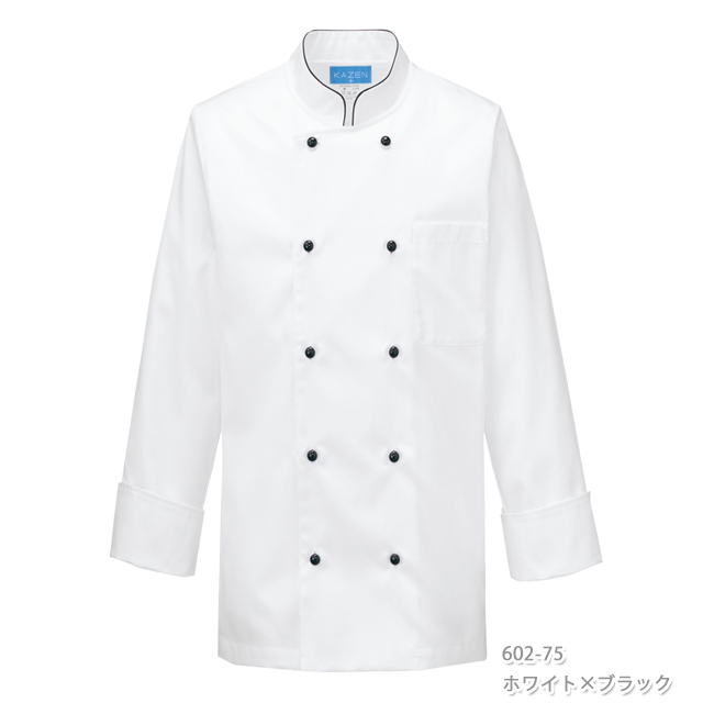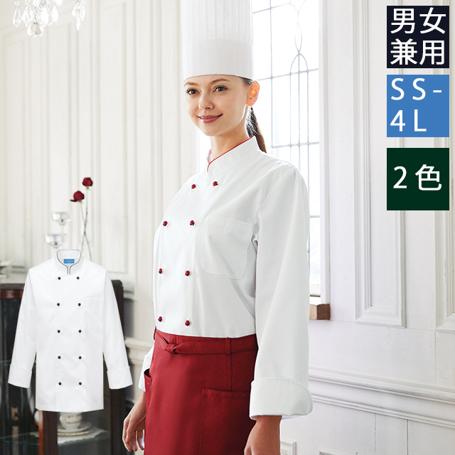 ワンポイントとなる配色デザインのコックコートはエプロンとのカラーコーディネートが可能で、オープンキッチンから調理学校まで幅広く着用いただけます。