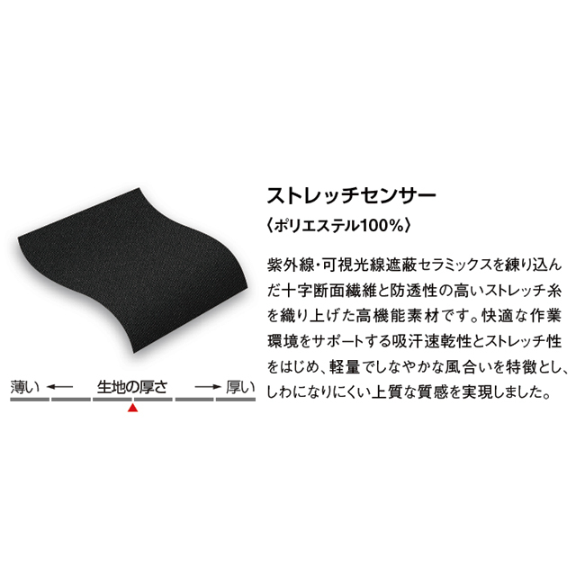 ●特徴:左胸両玉縁ポケット、ペン差しポケット(左袖)、袖口スリット、
