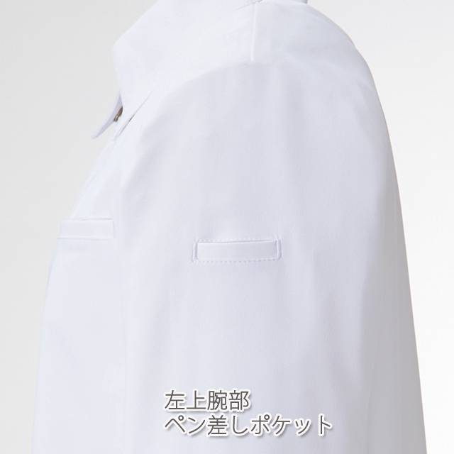 ●特徴:左胸ポケット、ペン差しポケット(左袖)、袖口スリット、