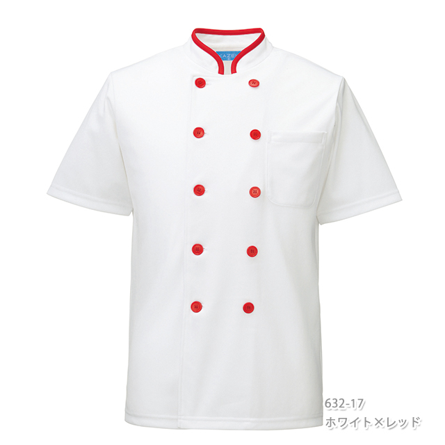 632 カゼン コックシャツ トリコットシャツ 半袖 男女兼用 左胸ポケット 裾口スリット入り KAZEN サービス フードユニフォーム フードサービス 食品 制服 レストラン 飲食 ホテル カラー ユニセックス 五分袖 5分袖 ブラック レッド系
