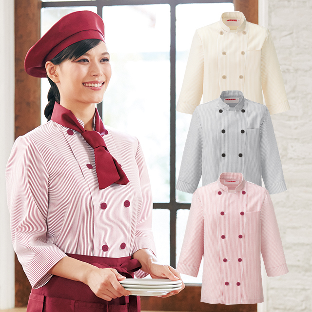 681 カゼン コックシャツ 七分袖 男女兼用 ストライプ柄 左胸ポケット 裾口スリット入り KAZEN サービス フードユニフォーム フードサービス 食品 制服 レストラン 飲食 ホテル カラー ユニセックス 7分袖 ブラック ベージュ レッド系